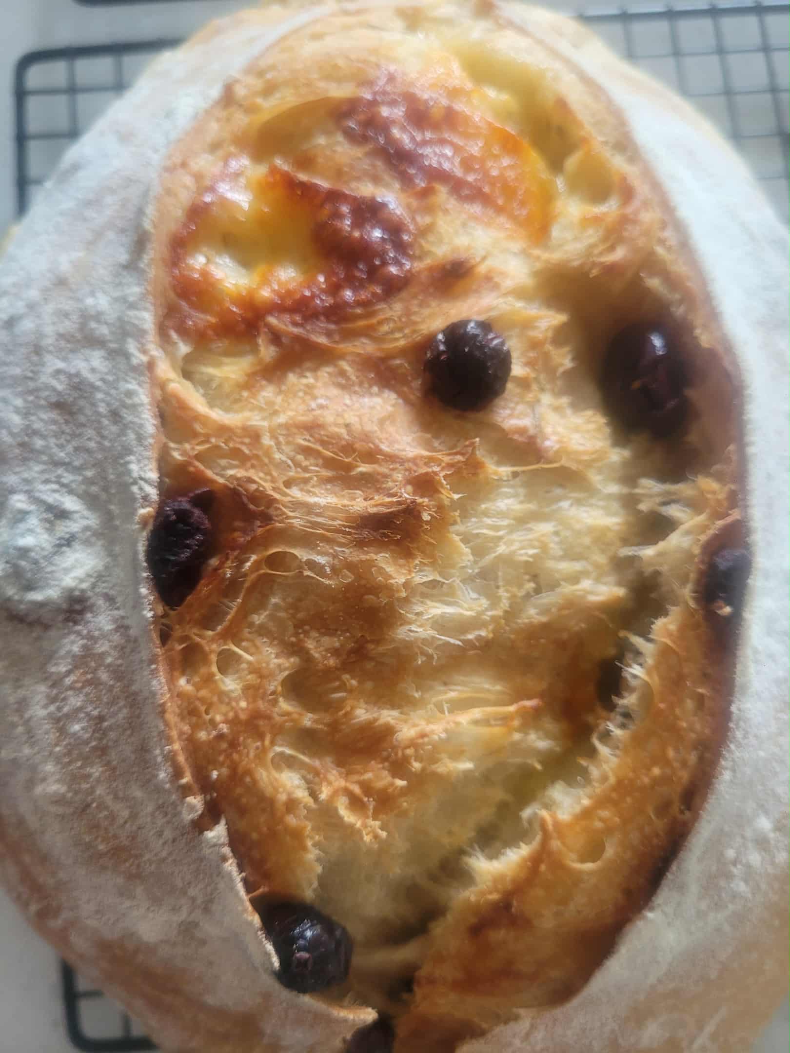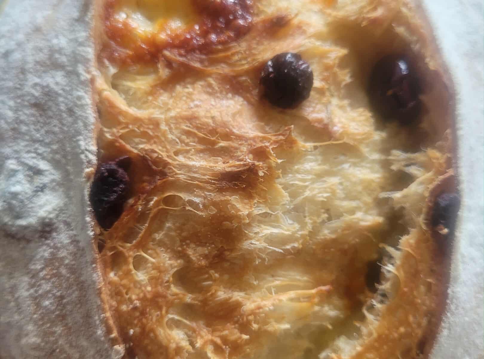 Ingredients: organic flour, water, starter, sharp white cheddar cheese, cranberries, cranberry butter (cranberries, maple syrup, water, orange juice and zest, cinnamon), orange juice and zest, olive oil, dried rosemary, sea salt.