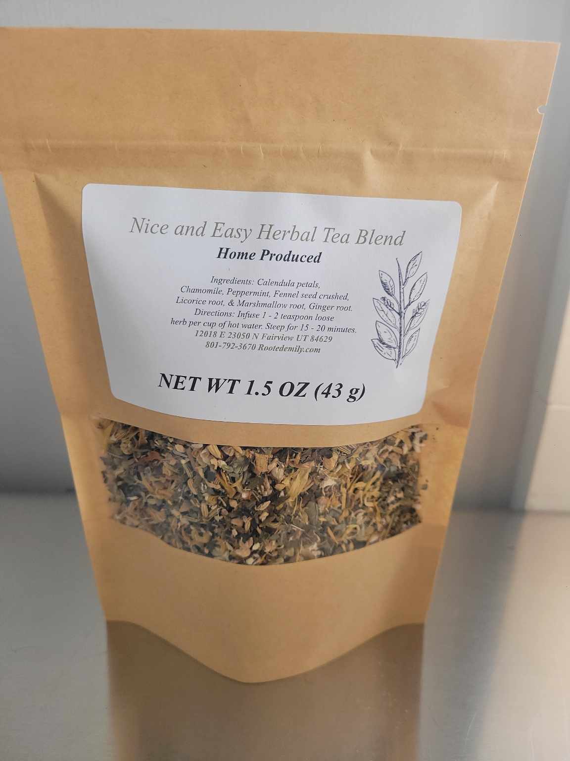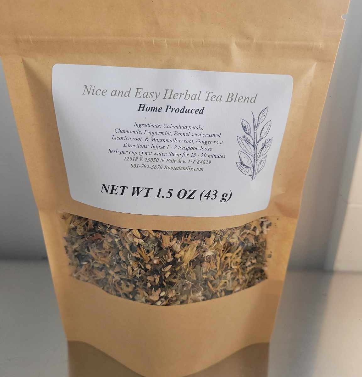 A great tea for after eating a large meal or a sensitive food. Ingredients: Calendula petals, Chamomile, Fennel seed, Ginger root, Licorice root, Marshmallow root, Peppermint. 2 oz bag