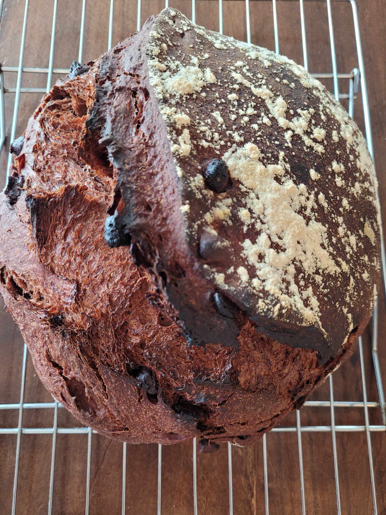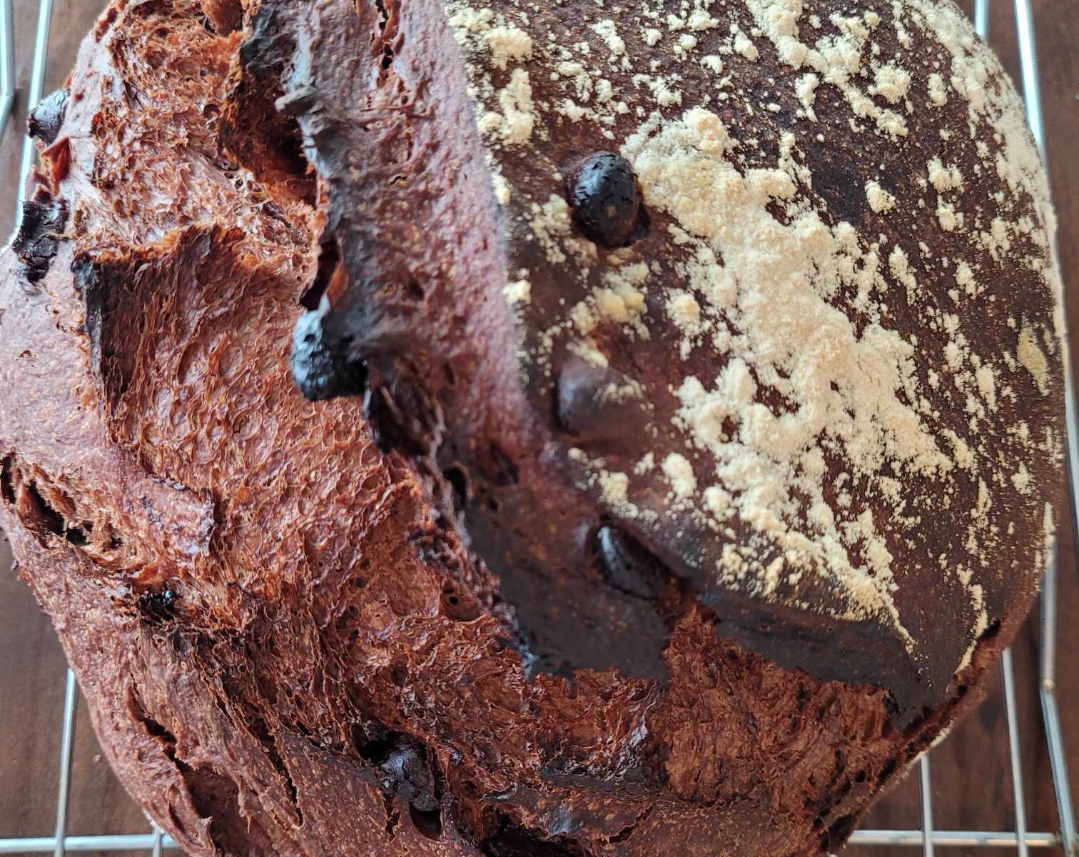 Rich and chocolatey. Ingredients: organic artisan flour (hard red wheat flour, malted barley flour), water, starter, semi-sweet chocolate chips (sugar, cocoa beans, cocoa butter, sunflower lecithin, vanilla), raw cacao, honey, MCT coconut oil, sea salt. 2 LB loaf. Contains wheat and coconut.