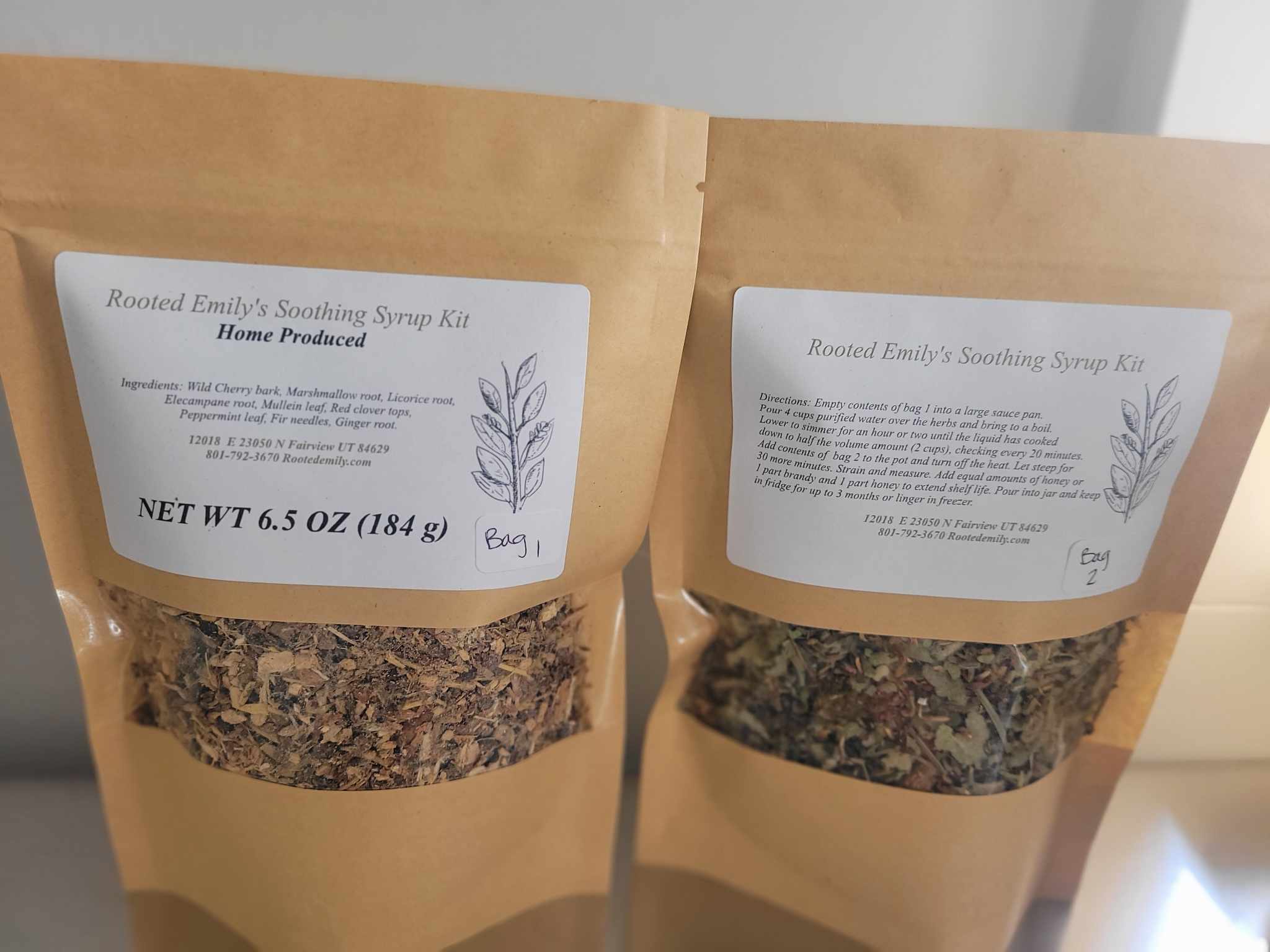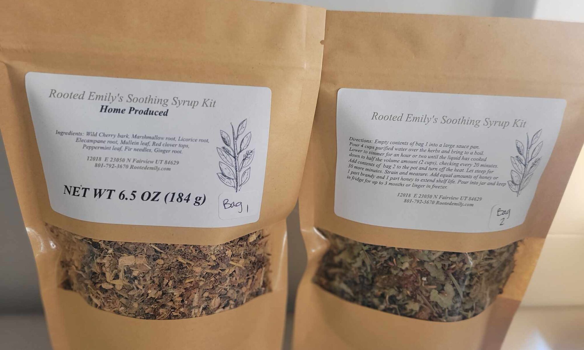 This syrup is very effective! Many people tell me they get relief right away and are able to sleep when kept up at night from a cough. This kit makes 1 quart of syrup. Directions included! Ingredients: (kit 1) licorice root, marshmallow root, wild cherry bark, elecampane root, ginger root. (kit 2) mullein leaf, red clover tops, peppermint leaf, fir needles. You will get 2 bags (2 OZ and 4.5 OZ ).