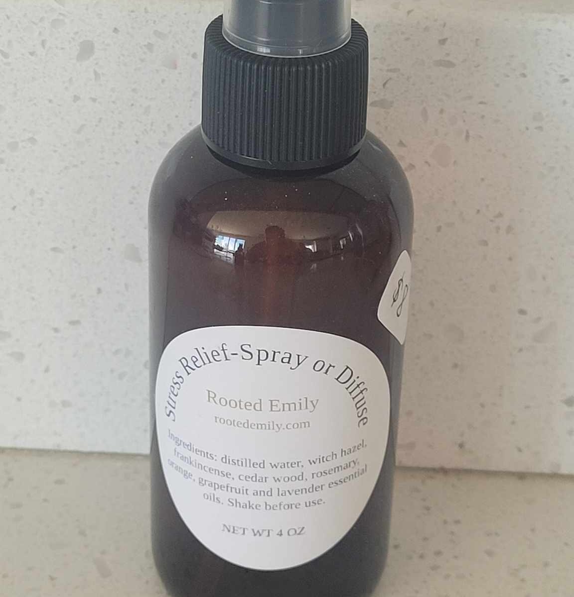 This aromatherapy spray can be sprayed in a room, car or on sheets and towels. Contents can also be placed in a diffuser. Ingredients: distilled water, witch hazel extract, frankincense, cedarwood, rosemary, orange, grapefruit, and lavender essential oils. 4 oz bottle.